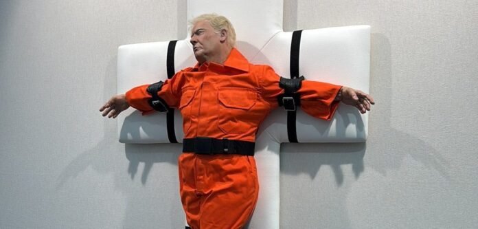 Masono darbas, kuriame Trumpas pavaizduotas Gvantanamo kalinių oranžiniais drabužiais, pririštas prie baltos kryžiaus formos konstrukcijos, primenančios mirtina injekcija vykdomų egzekucijų neštuvus, sukėlė aštrią reakciją tarp Bažnyčios lyderių ir teologų.