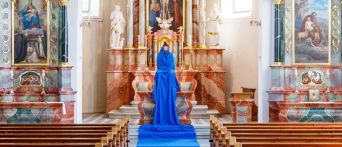 Bettina Filacanavo apsigaubė mėlyna paklode ir nuo 17 iki 20 val. tyliai sėdėjo bažnyčios soste, o „lankytojai vaikščiojo po koplyčią arba stebėjo performansą iš suolų”.