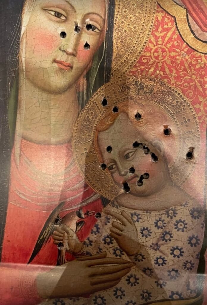 Paskelbtose nuotraukose buvo matomas Dievo Motinos Marijos su Kūdikėliu Jėzumi atvaizdas, nusėtas kulkų paliktomis skylėmis, taip pat ir abiejų figūrų galvų srityje. Vaizdas buvo paimtas iš aukcionų namų „Koller“ meno katalogo. Įrašą Ameti papildė žodžiu „Abschalten“ („Išsijungti“). Vėliau jis buvo pašalintas.