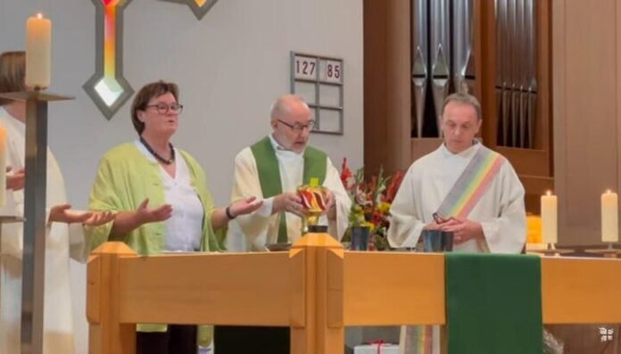 Pasak Cath.ch, Mišių vaizdo įraše „aiškiai matyti, kaip ji, vilkinti civiliais drabužiais, stovi prie altoriaus, apsupta dviejų kunigų ir kartu su jais, ištiesusi rankas, taria duonos ir vyno konsekracijos bei eucharistinės maldos tekstą”.