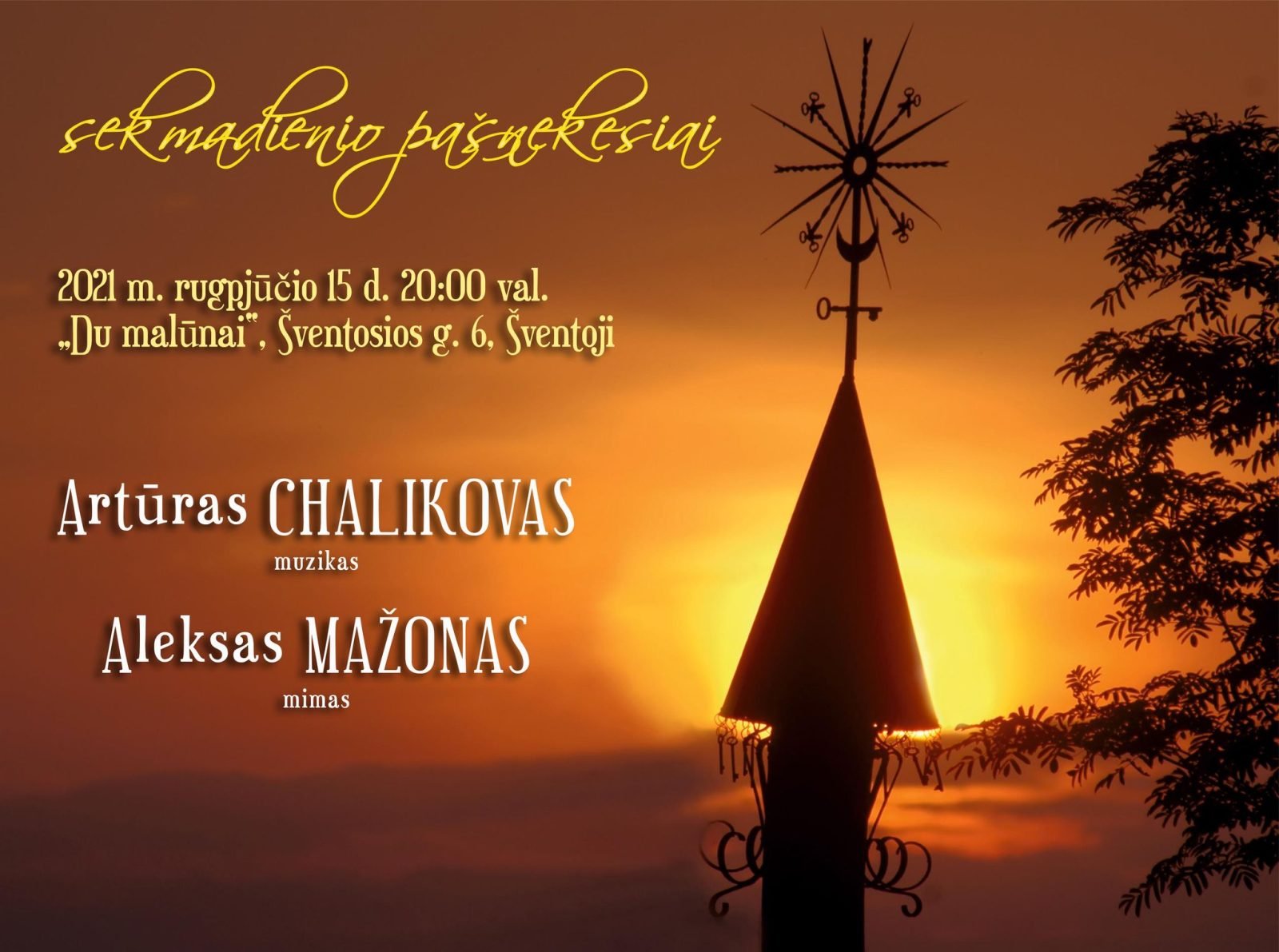 Rugpjūčio 15 d. 20.00 val. restorane „Du malūnai“ (Šventosios g. 6, Šventoji) vyks susitikimas su giesmių autoriumi ir atlikėju Artūru Chalikovu bei mimu Aleksu Mažonu.