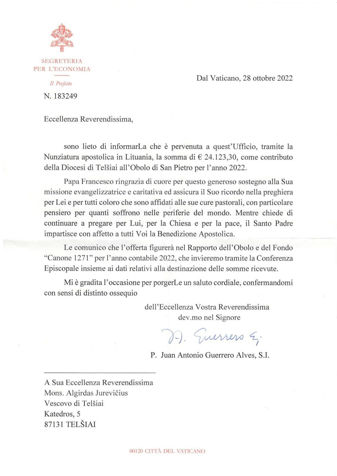 Vatikano Ekonomikos sekretoriato prefektas Juanas Antonio Guerrero Alvesas SJ (Chuanas Antonijus Gereras Alvezas) padėkojo Telšių vyskupijos tikintiesiems už aukas, skirtas paremti popiežiaus vykdomus artimo meilės darbus.