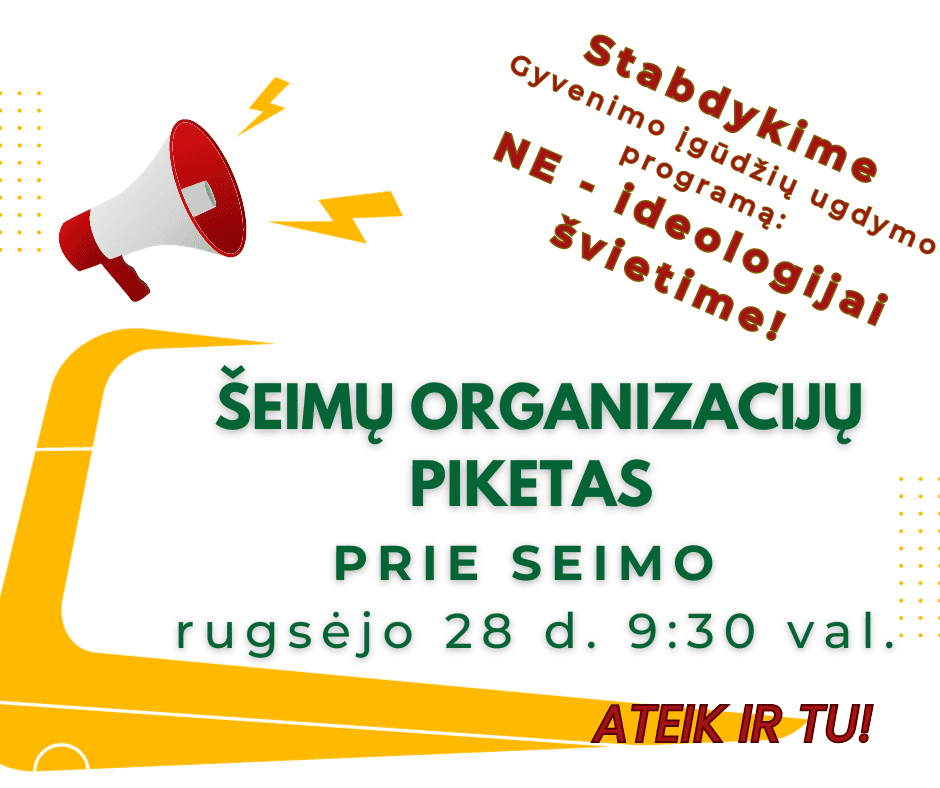 Kviečiame ir kitas NVO bei visus GĮUP nepritariančius tėvus, globėjus, senelius š.m. rugsėjo 28 d. 9.30 val. atvykti prie LR Seimo ir pasakyti: Stabdykime Gyvenimo įgūdžių ugdymo programą: NE ideologijai švietime!”
