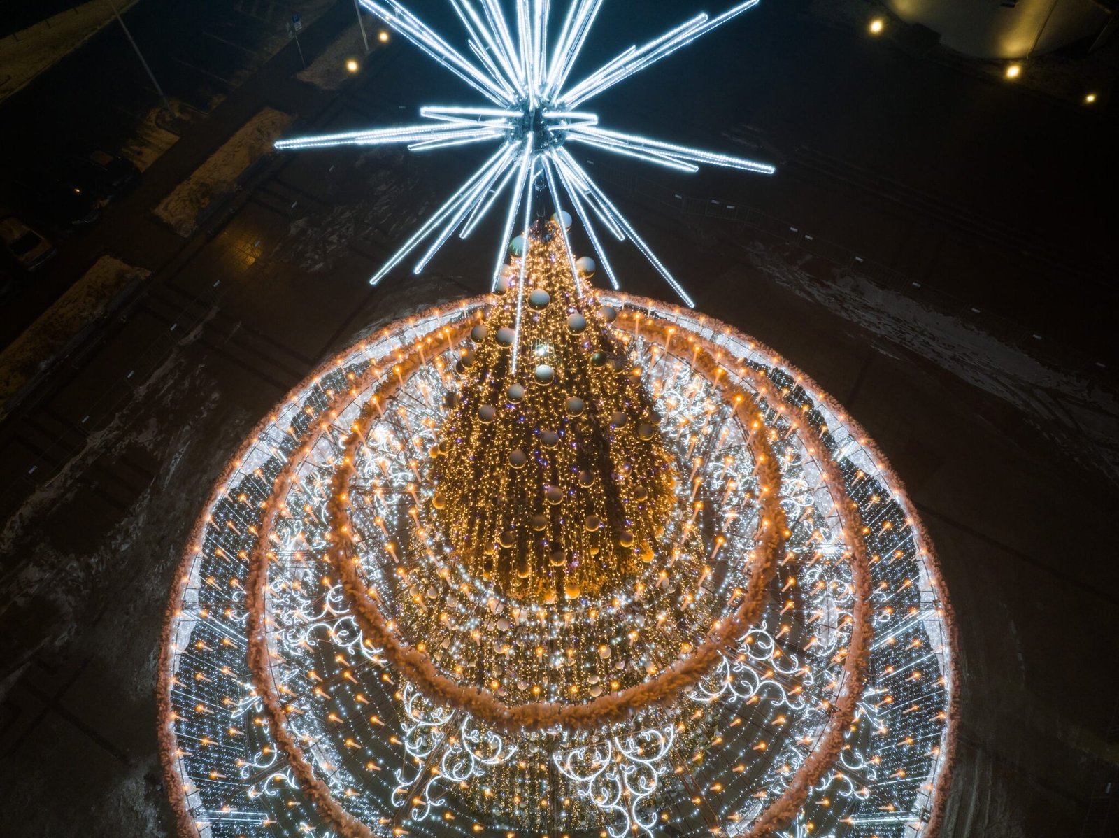 25 metrų aukščio ir 22 metrų skersmens, trijų pakopų elegantiškojo torto forma sukonstruota iš šviečiančių baroko stiliaus puošmenų: ritmiškai atsikartoja kolonos, kabo dekoratyvūs sietynai. Visus tris aukštus puošia baltai šviečiančios baroko stiliaus dekoracijos, o 700 gimtadienio žvakučių sužibo šiltai balta spalva. Meninės kompozicijos centre – aukso spalvos žaislais ir tviskančiomis girliandomis išpuošta Kalėdų eglė. Eglės viršūnę puošia torto žvakės liepsnelė – „fontanas“.