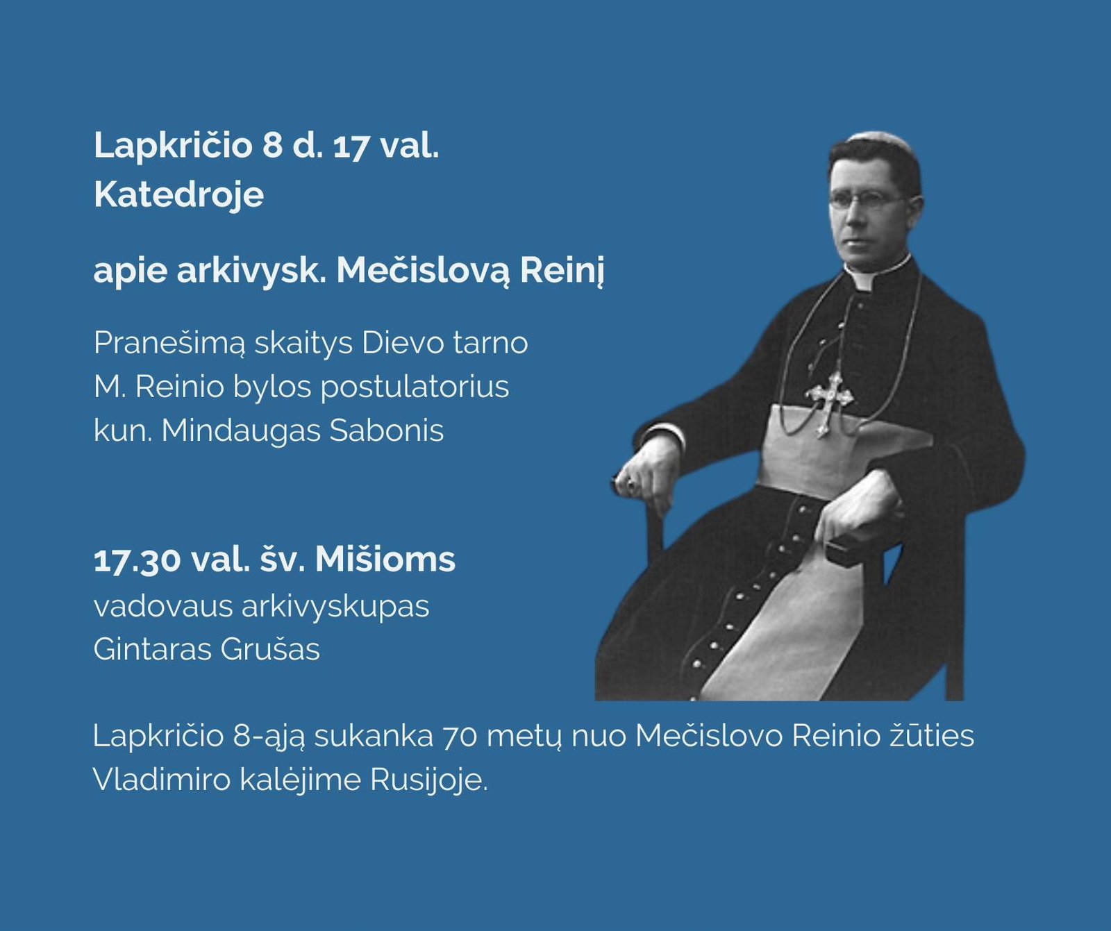 Lapkričio 8 d., trečiadienį, 17 val. visi tikintieji kviečiami Vilniaus katedroje išgirsti apie arkivyskupo Mečislovo Reinio asmenybę, kuo aktualus Mečislovas Reinys šiandien. Pranešimą skaitys Dievo tarno M. Reinio bylos postulatorius kun. Mindaugas Sabonis.