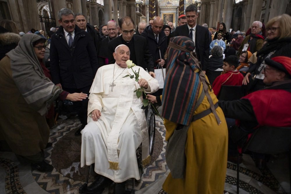Galiausiai pavakare į baziliką atvyko popiežius Pranciškus. Kaip paprastai prieš visas apaštališkąsias keliones jis visų pirma užėjo pasimelsti į Dievo Motinos – Salus Populi Romani – ikonos koplyčią. Po to jis pagerbė šioje bazilikoje nuo seno saugomą  Betliejaus prakartėlės relikviją ir galiausiai pasveikino gyvosios prakartėlės eisenos dalyvius.