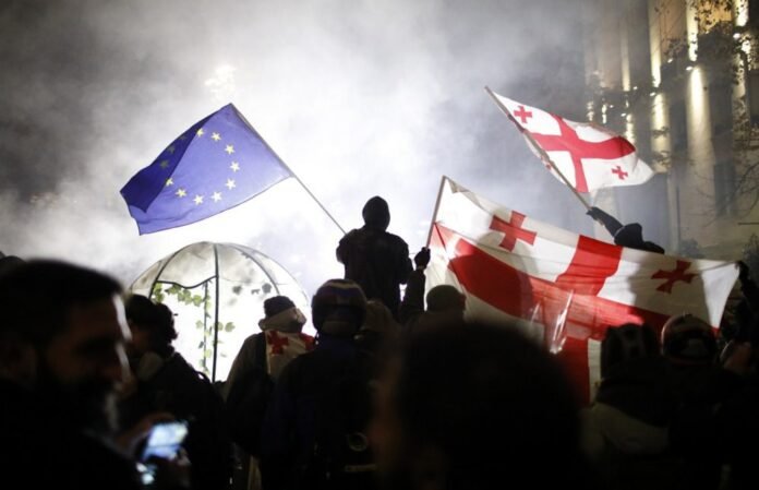 Ankstesnę naktį policija panaudojo vandens patrankas, pipirines dujas ir ašarines dujas, kad išsklaidytų protestuotojus, kurie išėjo į Tbilisio gatves po to, kai ministras pirmininkas Iraklis Kobachidzė iš valdančiosios partijos „Sakartvelo svajonė“ paskelbė apie derybų sustabdymą. Vidaus reikalų ministerija pranešė, kad tąkart per protestus sulaikė 43 žmones.