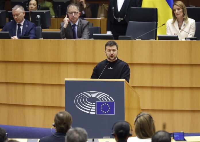 Trečiadienį apsilankęs Londone ir Paryžiuje, kur ragino Didžiąją Britaniją, Prancūziją ir Vokietiją tiekti jo šaliai modernius naikintuvus ir tolimojo nuotolio raketas, karo meto lyderiu tapęs buvęs aktorius atvyko į Briuselį kreiptis į ES vadovus ir Europos Parlamento narius.