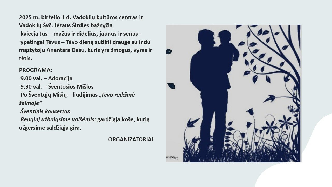 „2025 m. birželio 1 d. Vadoklių kultūros centras ir Vadoklių Švč. Jėzaus Širdies bažnyčia kviečia Jus – mažus ir didelius, jaunus ir senus, o ypač Tėvus – švęsti Tėvo dieną drauge su indu mąstytoju Anantara Dasu, kuris yra žmogus, vyras ir tėtis,” – rašoma feisbuke patalpintame skelbime.