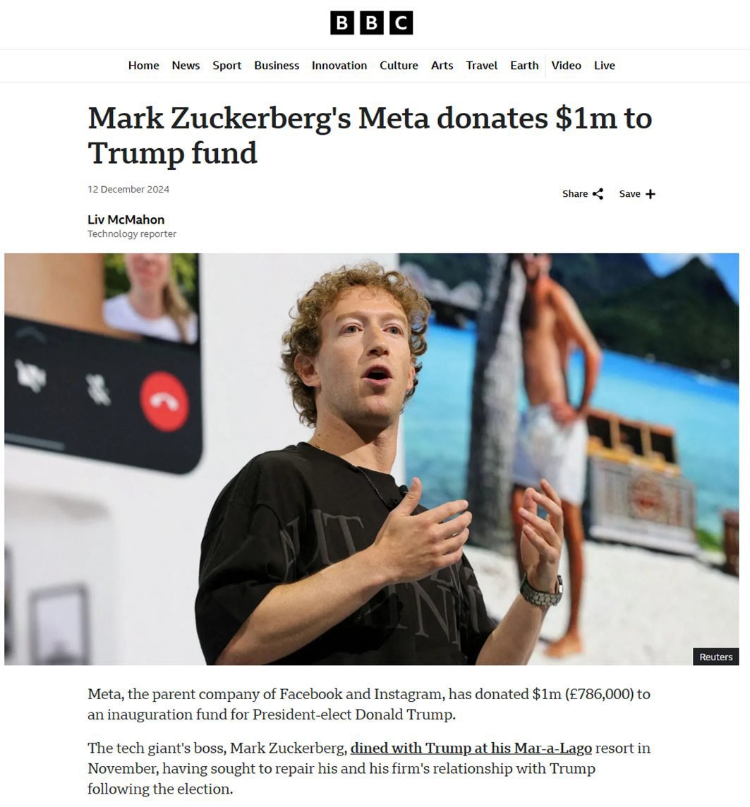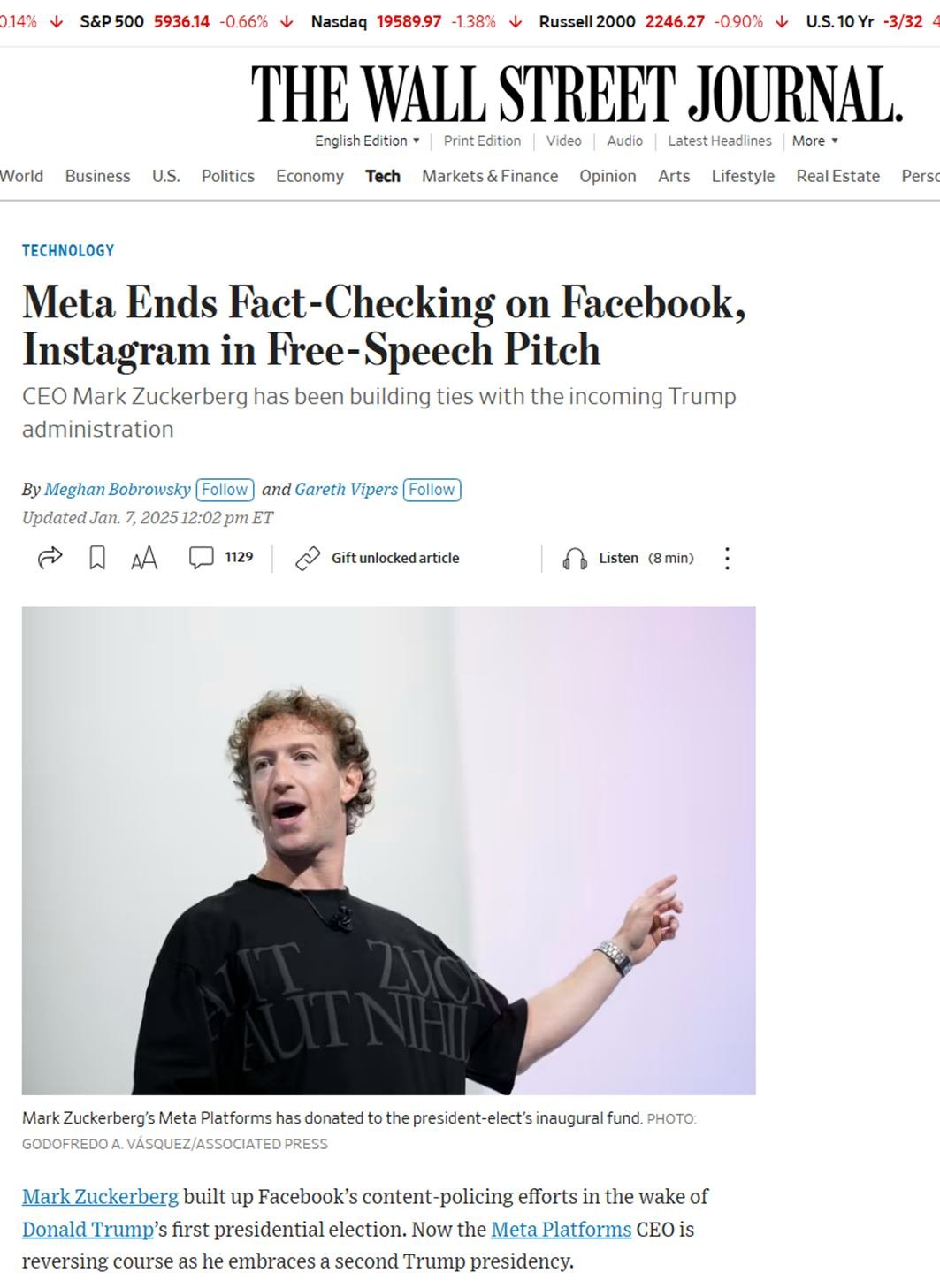 Sausio 6 d. Kongrese įvyko JAV prezidento rinkimų sertifikavimas. Nuo šiol D.Trumpas yra oficialiai patvirtintas JAV prezidentu. Iškart po to pareiškimą paskelbė socialinio tinklo „Facebook“ savininkas Markas Zuckerbergas. Istorijos vėjas papūtė į Donaldo Trumpo bures, ir „Facebook“ vadovas keičia kursą: panaikins cenzūrą ir išvaikys faktų tikrintojus. Be to, dalį savo biuro iš demokratų partijos tvirtovės – Kalifornijos valstijos – perkelia į respublikonų valdomą Teksasą. „Perkėlus „Meta“ pasitikėjimo ir saugumo bei turinio moderavimo komandas į Teksasą, sumažės nuogąstavimų dėl šališkumo“, – sakė M. Zuckerbergas.