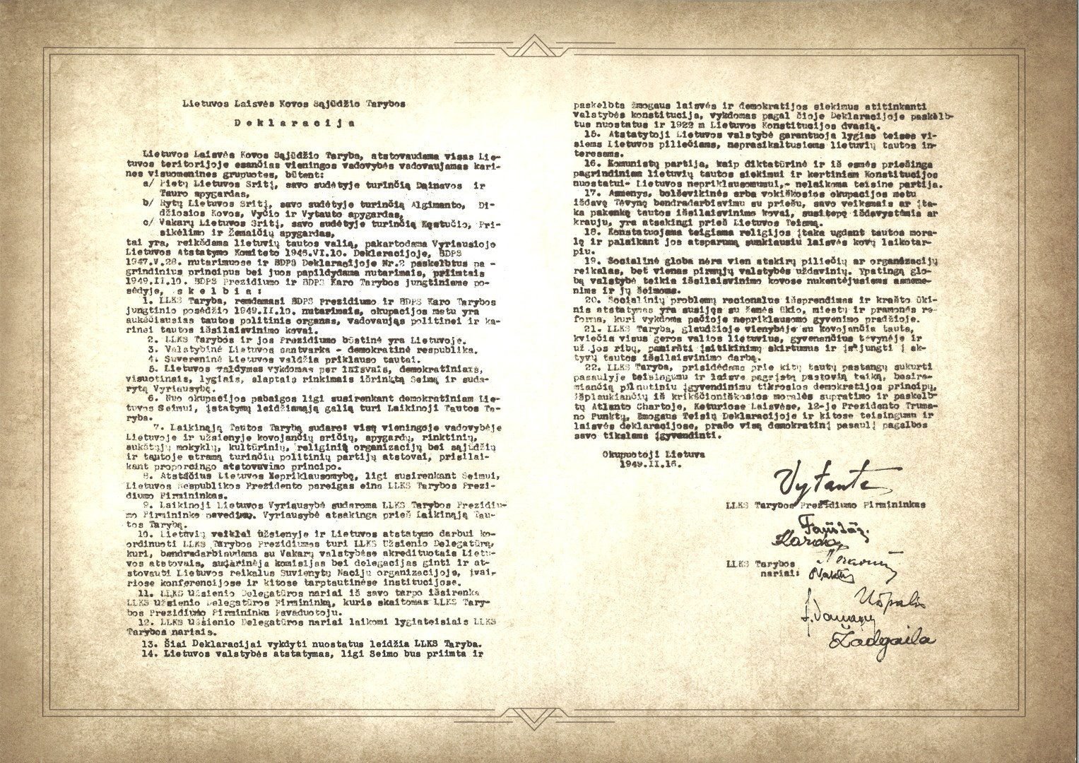 1949 m. vasario 16 d. Lietuvos laisvės kovų sąjūdžio (LLKS) nariai pasirašė vieną reikšmingiausių dokumentų mūsų valstybės istorijoje. Jis ekspertų, kartu su 1918 m. vasario 16 d. Lietuvos nepriklausomybės ir 1990 m. kovo 11 d. atkurtos Lietuvos nepriklausomybės aktais, įvardinamas kaip vienas iš trijų šiuolaikinės valstybės Konstitucijos stulpų.