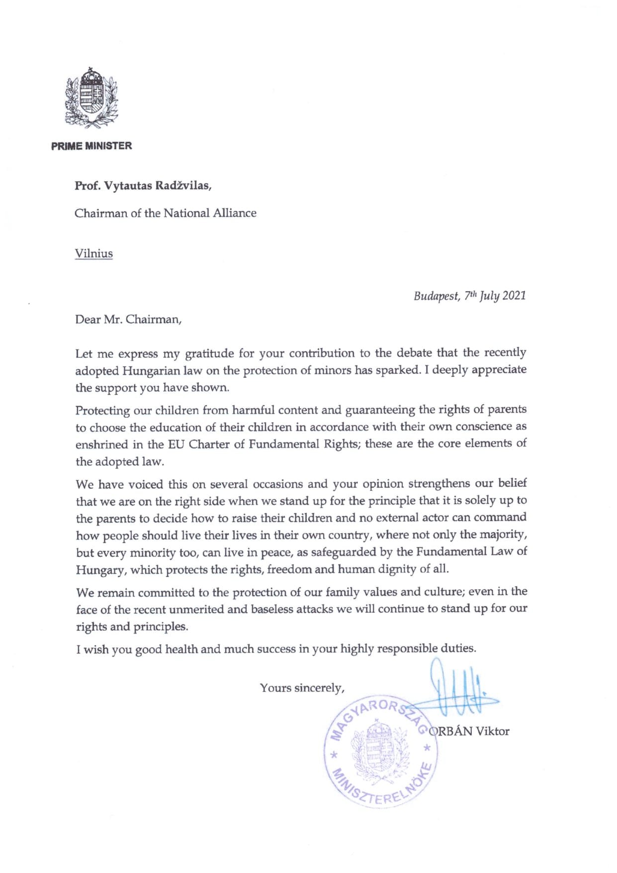 Nacionalinio susivienijimo atstovai pranešė, kad partijos pirmininkas Vytautas Radžvilas gavo laišką iš Vengrijos premjero Viktoro Orbano, kuriame dėkojama už palaikymą.