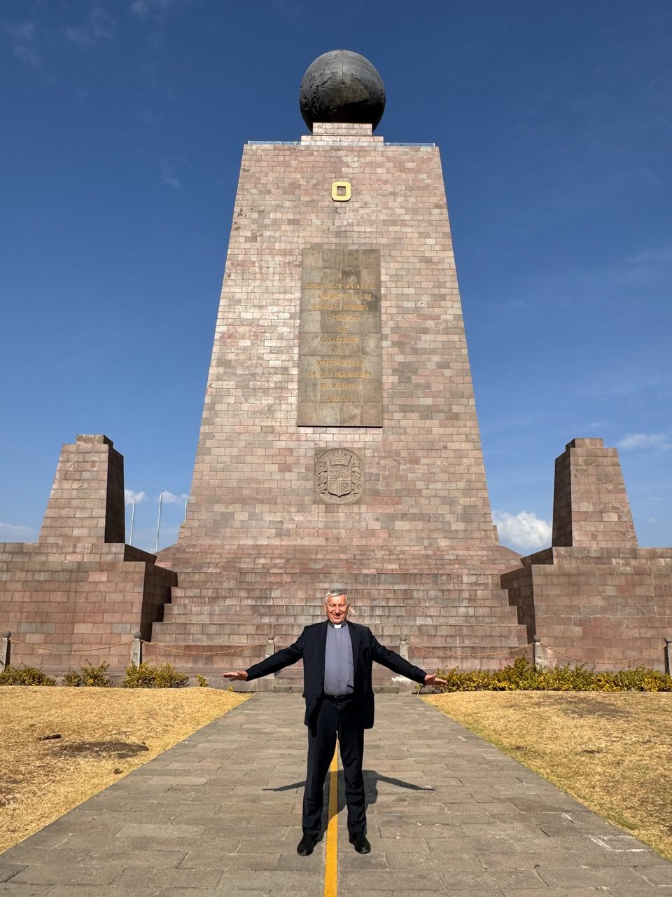 Ekvadore galima atsistoti ir per abi pasaulio puses, už vyskupo nugaros – pasaulio geografinio centro žymuo / Vysk. R. Norvilos nuotr.