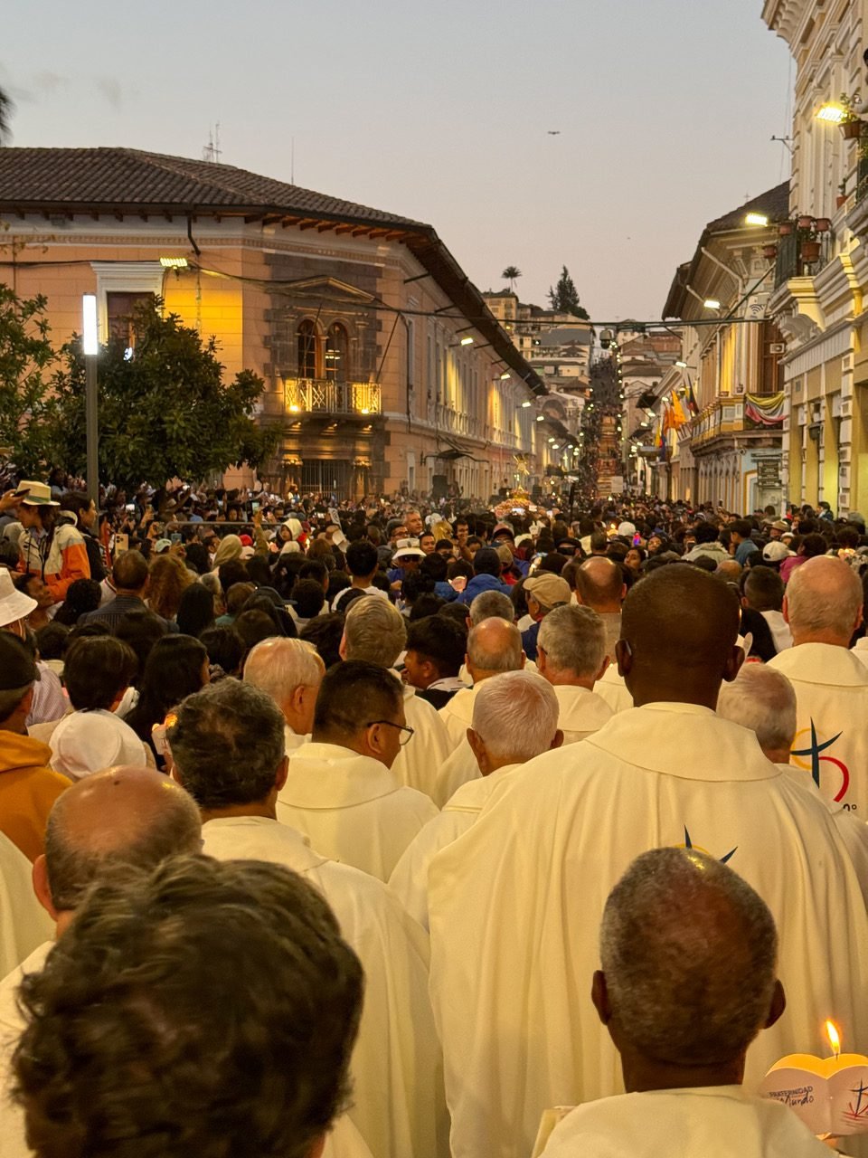 Šeštadienio šventos Mišios vyko pavakare svarbioje Kito miesto Šv. Pranciškaus aikštėje ir po jų visi dalyviai jungėsi į eucharistinę procesiją senamiesčio gatvėmis į mano jau paminėtą Nacionalinę pasiaukojimo baziliką. Visas procesijos kelias buvo išklotas, gal tikriau išpuoštas nepertraukiamu gėlių kilimu. Įvairios bendruomenės, žmonių grupės po nedidelį plotą gatves buvo išpuošę įvairiais ornamentais, atvaizdais, sukomponuotais iš gėlių žiedų, jų žiedlapių. Nebus per stipru pasakyti, jog šis vaizdas atrodė tiesiog pritrenkiantis. Gal apie pusantro kilometro ilgio ir viso gatvės pločio vientisam kilimui, matyt, reikėjo ne mažiau kaip šimtų tūkstančių, jei ne milijono natūralių gėlių žiedų. Jį suruošti dirbo šimtai, gal net tūkstančiai žmonių. Apie tai kalbant galima prisiminti ir kelionėje girdėtą pasakojimą, jog Ekvadore auginama labai daug gėlių, ypač rožių. Todėl sakoma jog ekvadoriečiui pasiperšant sužadėtinei dovanoti keletą rožių būtų per mažai. Jų tokia proga turėtų būti bent šimtas. Taigi ruošiantis eucharistinei procesijai Viešpačiu buvo padovanota gal ir koks milijonas.