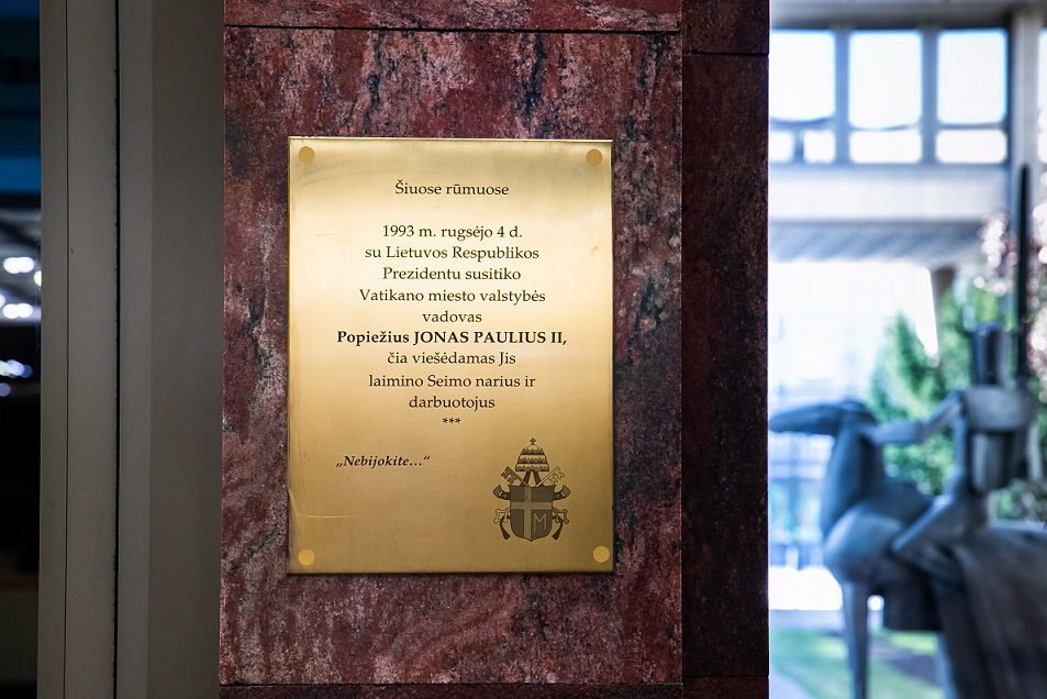 1993 m. rugsėjo 4-8 d. popiežius Jonas Paulius II lankėsi Lietuvoje. Šį istorinį vizitą primena atminimo lentelė Seimo I rūmuose ir III rūmuose įrengta popiežiaus Jono Pauliaus II aula.