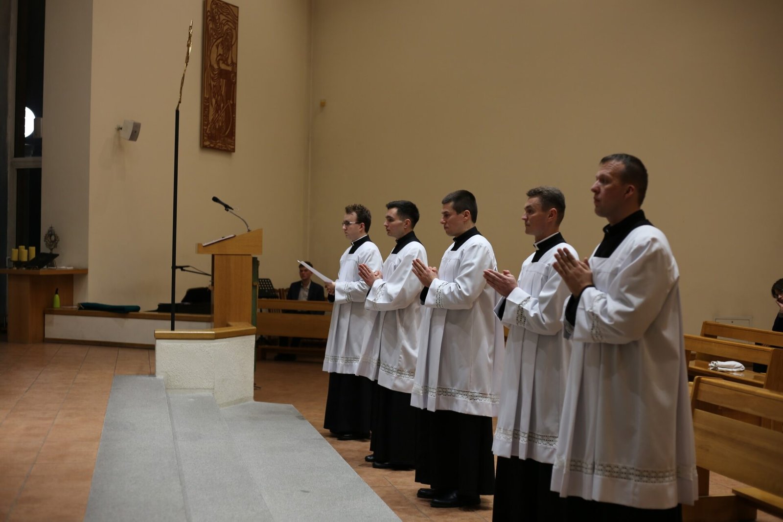 Šventimų išvakarėse būsimieji diakonai davė celibato priesaiką. Ceremonijai vadovavo Vilniaus vyskupas augziliaras Arūnas Poniškaitis.