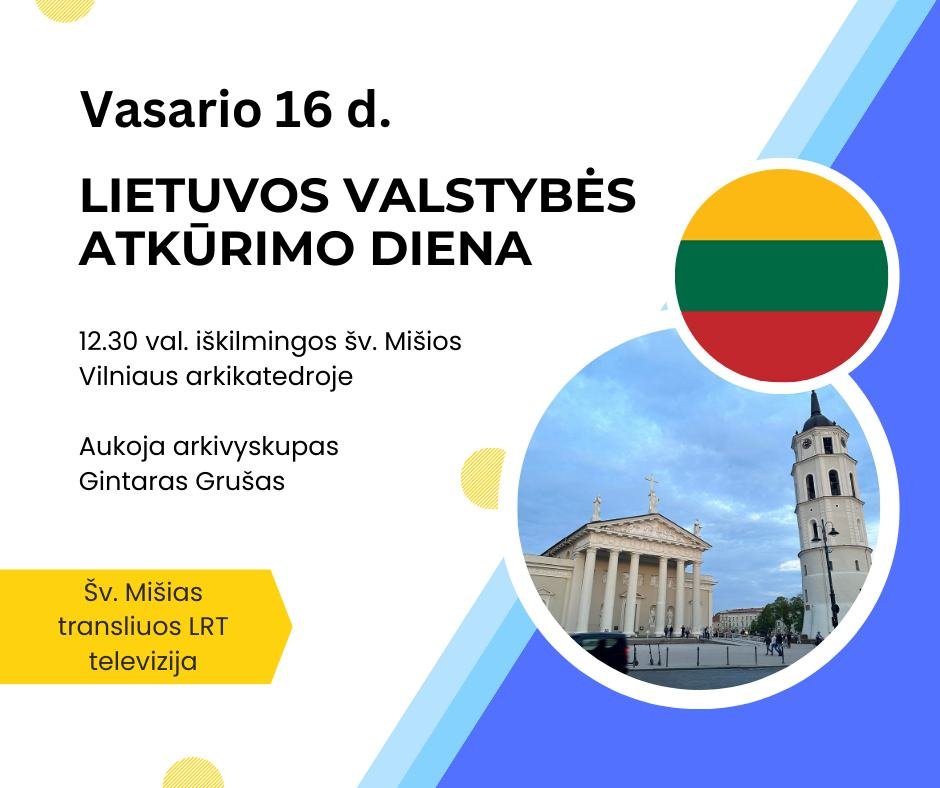 Vasario 16-ąją bus minima Lietuvos Valstybės atkūrimo diena. Šią šventinę dieną kviečiama melstis už Lietuvą. Vilniaus katedroje vyks iškilmingos Mišios su arkivyskupu Gintaru Grušu, praneša Vilniaus arkivyskupija.