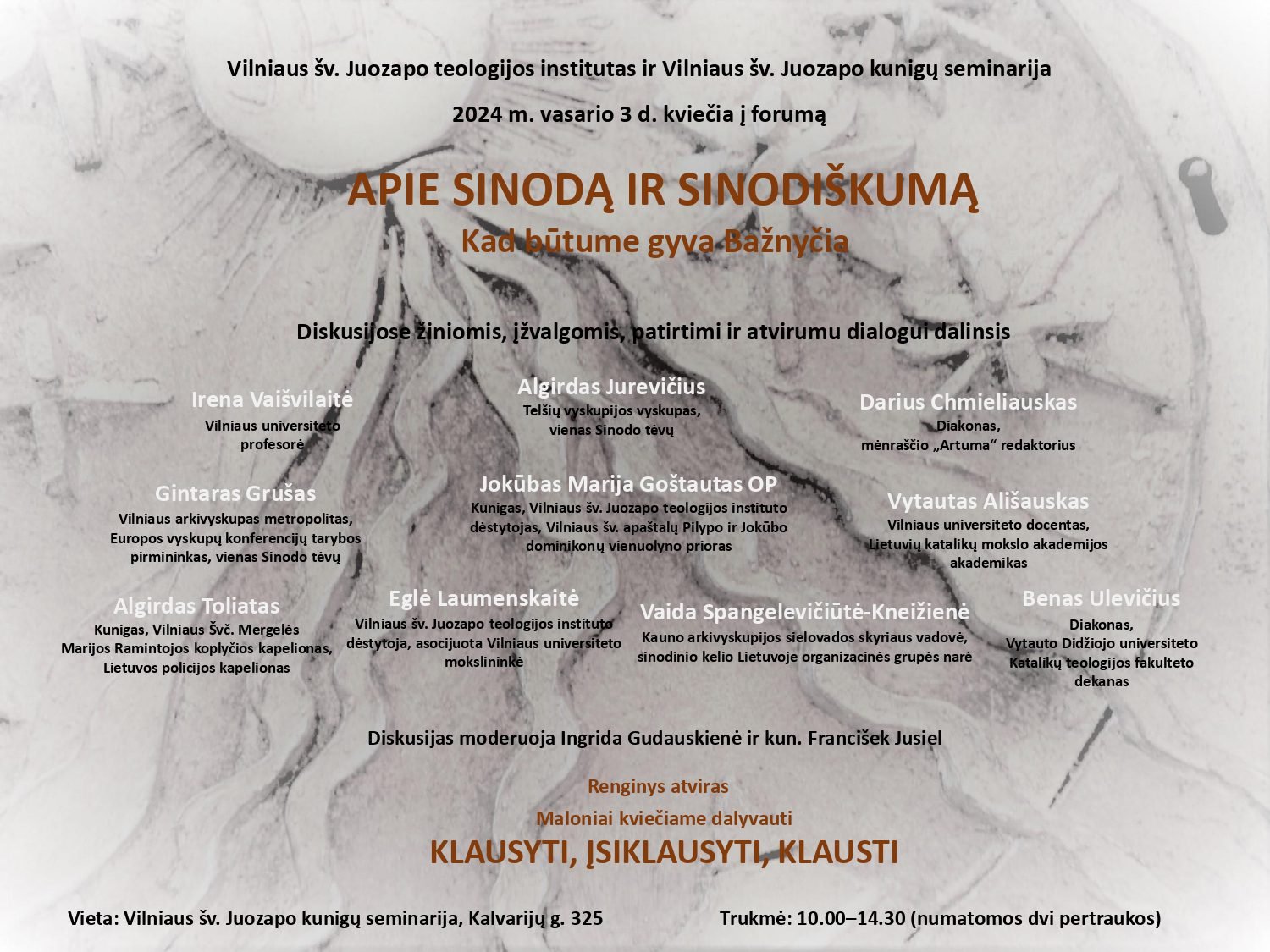 „Kas yra sinodas ir sinodiškumas? Kiekvienas iš mūsų uždavėme šį klausimą sau ir norėjome sužinoti, kas tai yra ir ką tai reiškia konkrečiai man? Maloniai kviečiame vasario 3 d., 10:00 val. Vilniaus kunigų seminarijoje atrasti atsakymą ir pagilinti žinias apie sinodą”, – dalinamasi kvietime.