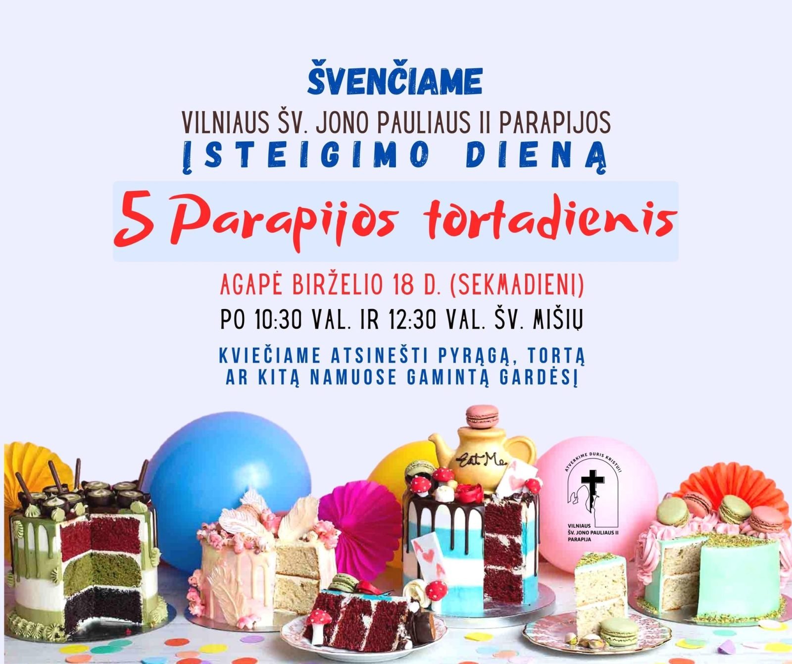 „Parapijos gimtadienį šį kartą pavadinome 5 metukų tortadieniu. Tad artėjantį sekmadienį (birželio 18d.) kviečiame dalyvauti šv. Mišiose 10.30 val. (LT) ir 12:30 val. (PL). O po šv. Mišių visus kviečiame į agapę, kur vaišinsimės pačių pagamintais gardumynais”, – kviečiami tikintieji.