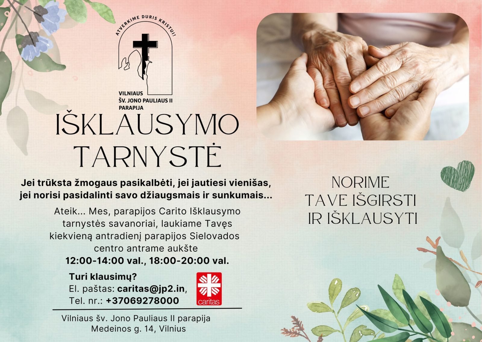 Vilniaus Šv. Jono Pauliaus II parapija skelbia apie galimybę kiekvieną savaitės antradienį būti išklausytam ir kviečia ateiti pasikalbėti visus, kurie nori būti išgirsti ir suprasti. Jei trūksta žmogaus pasikalbėti, jei jautiesi vienišas, jei norisi pasidalinti savo džiaugsmais ir sunkumais, esi laukiamas šioje parapijoje.
