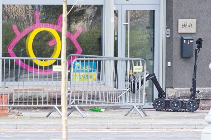 Vilniaus centre, Gedimino prospekte, Antiteroristinių operacijų rinktinės „Aras“ išminuotojai su vandens patranka sunaikino įtartiną daiktą, rastą prie Laisvės partijos būstinės.