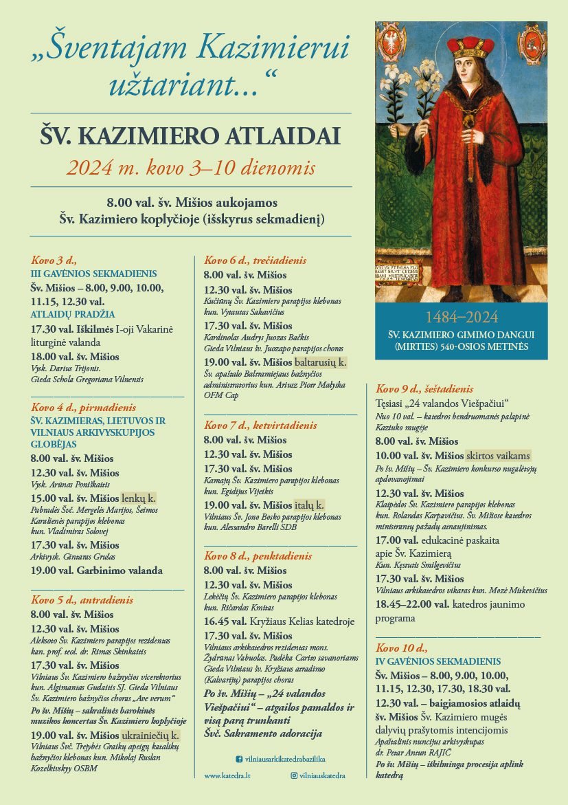 Kasmet kovo 4-ąją Bažnyčia švenčia šv. Kazimiero iškilmę. Šiais metais kovo 3–10 dienomis Vilniaus arkikatedroje vyks Šv. Kazimiero atlaidų savaitė „Šventajam Kazimierui užtariant…“.