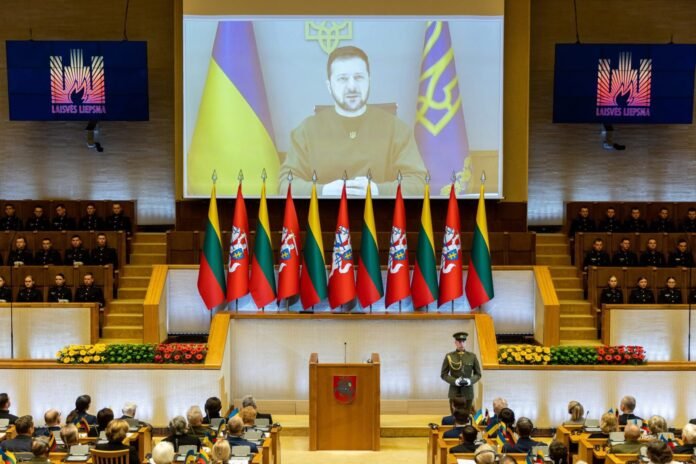 Mieli draugai, ponas Prezidente Gitanai, ponia pirmoji ledi Diana, ponia Pirmininke, ponia Ministre Pirmininke, ponia Paule Kuzmickiene, aš labai dėkingas už visus žodžius. Ponai Seimo nariai, visi dalyviai, mieli Lietuvos žmonės, džiaugiuosi galėdamas jus pasveikinti ir noriu iš karto padėkoti už tai, kad jūs nė vieną minutę neišdavėte laisvės. Ir ne tik per šias 323 žiaurias nežmoniško Rusijos karo dienas. Nuolat jaučiame jūsų palaikymą, ir ilgus metus, nuolatos, kai laisvos lietuvių širdys ir Lietuvos kelias į vieningą Europą įkvepia daugybę žmonių įvairiose šalyse, kurias kadaise pavergė Rusija.