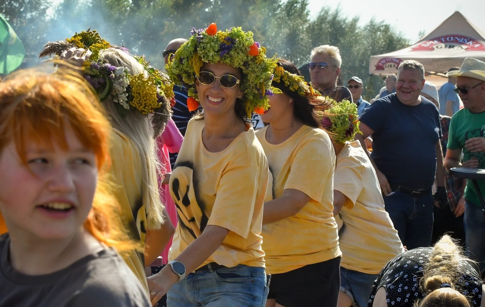 Nuotaikingai nusiteikusių vydmantiškių draugų komanda šypsenomis puošė ne tik savo veidus, bet ir marškinėlius – draugai šventėje dalyvauja jau ne pirmus metus ir šiemet trečią kartą kvietė vaišintis jų specialioje krosnyje kepamu kugeliu, kuriam pagaminti prireikė 5 maišų bulvių.