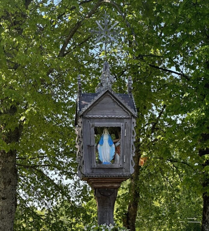 Žemaičių kaimo muziejuje gegužės 20 d. Turtingo ūkininko sodybos kieme prie koplytstulpio Dievo Motinos garbei vyko mojavos – tradicinės gegužinės pamaldos.